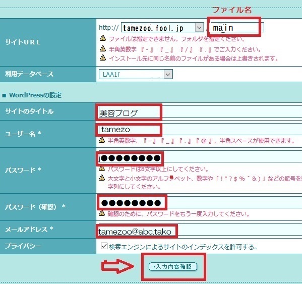 ![]() ここで初心者の方は何んだかわからなくて戸惑ってしまいます・・ でもだいじょうぶだよ・・ ファィル名欄をmainにしてみました。 URLは、http://tamezoo.fool.jp/となります。 これを主サイトにします。 ユーザー名とログインパスワードは忘れないようメモってね!! ![]() ![]() 初心者の方は・・入力確認をクリックしてつぎへ進もう!! |