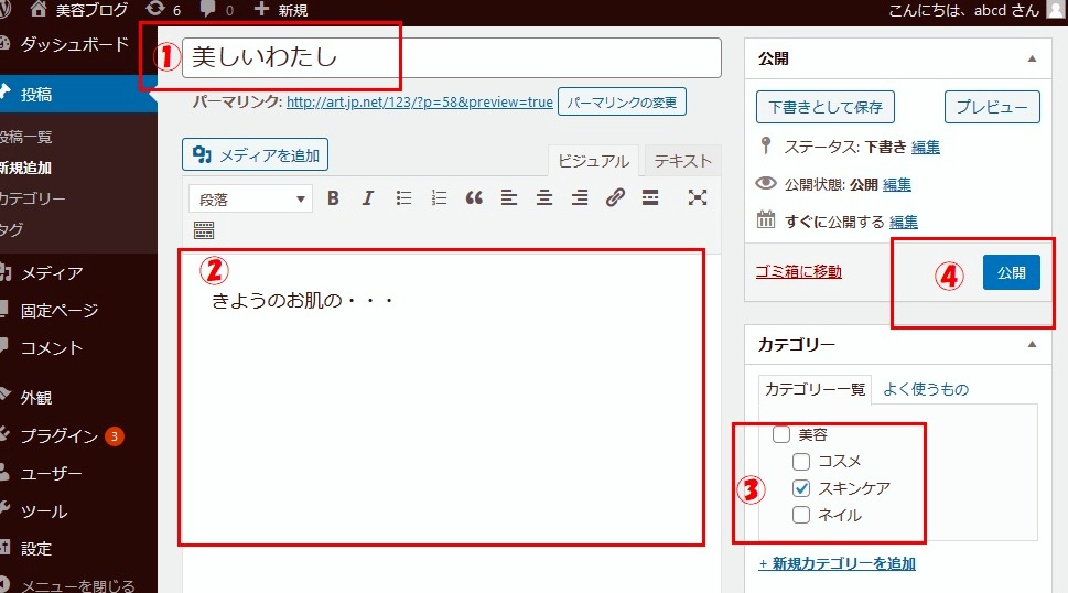 初心者の方はあまり気にせずに!!![]() ①タイトル記入 ②記事を書く ③カテゴリーにチェック ④公開クリックはい出来上がり・・簡単でしょ!! |