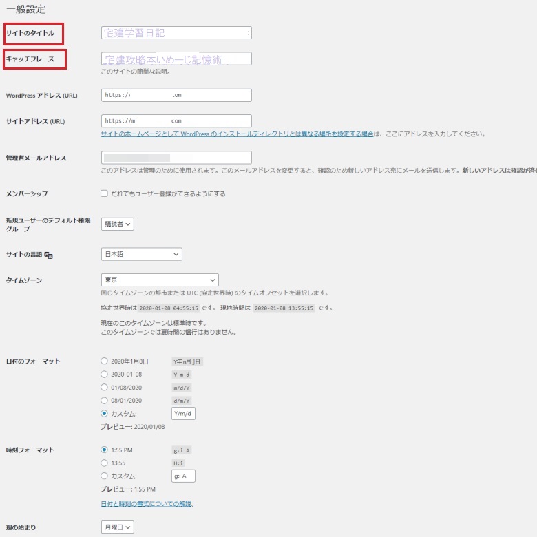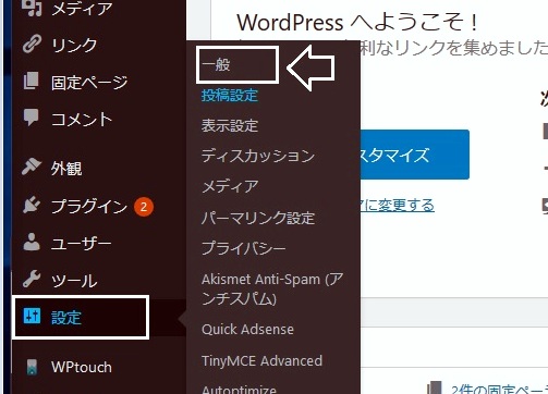 | ワードプレスの初期設定の項目の一般を開きます。